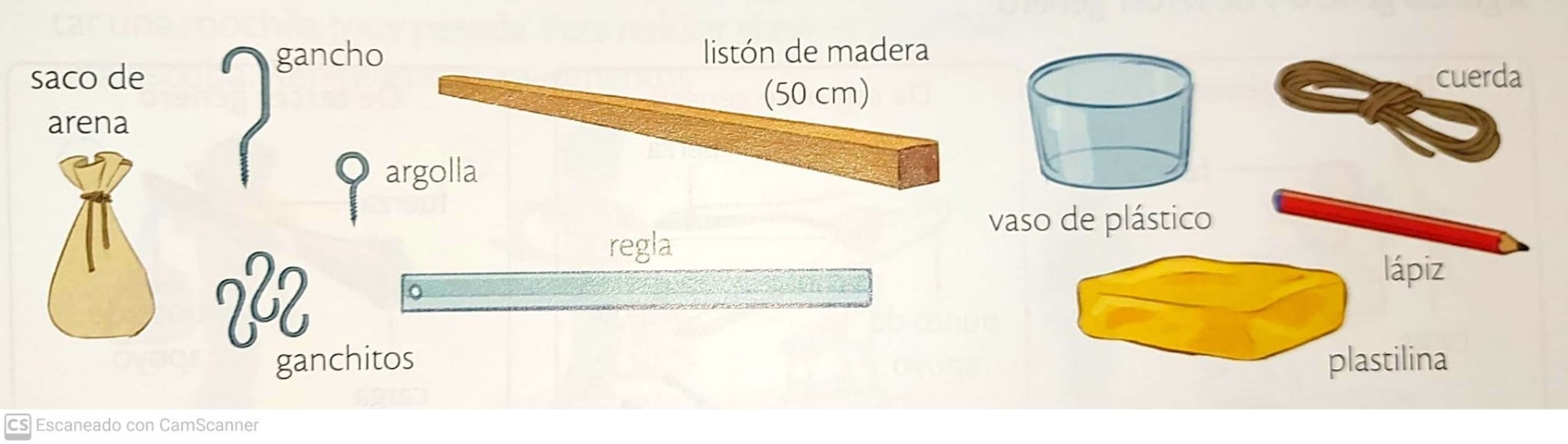 Para este taller necesitamos un saco de arena, un gancho, una argolla, ganchitos, una regla, un listón de madera(50cm), un vaso de plástico, una cuerda, un lápiz y plastilina.
