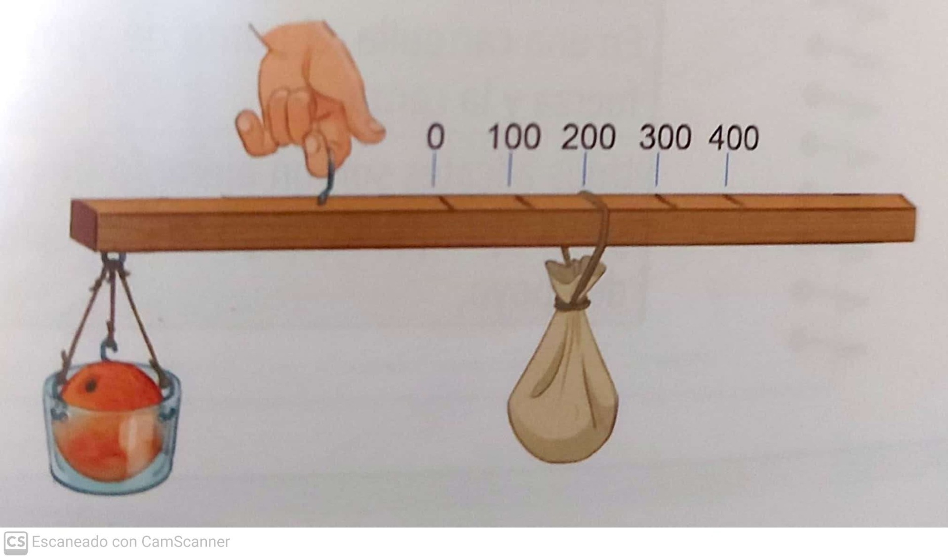 Paso 4: Ponemos en el vaso masas conocidas (200g, 300g...) y equilibramos la balanza con el saco. Ahora, marca sobre la barra los valores de las masas.